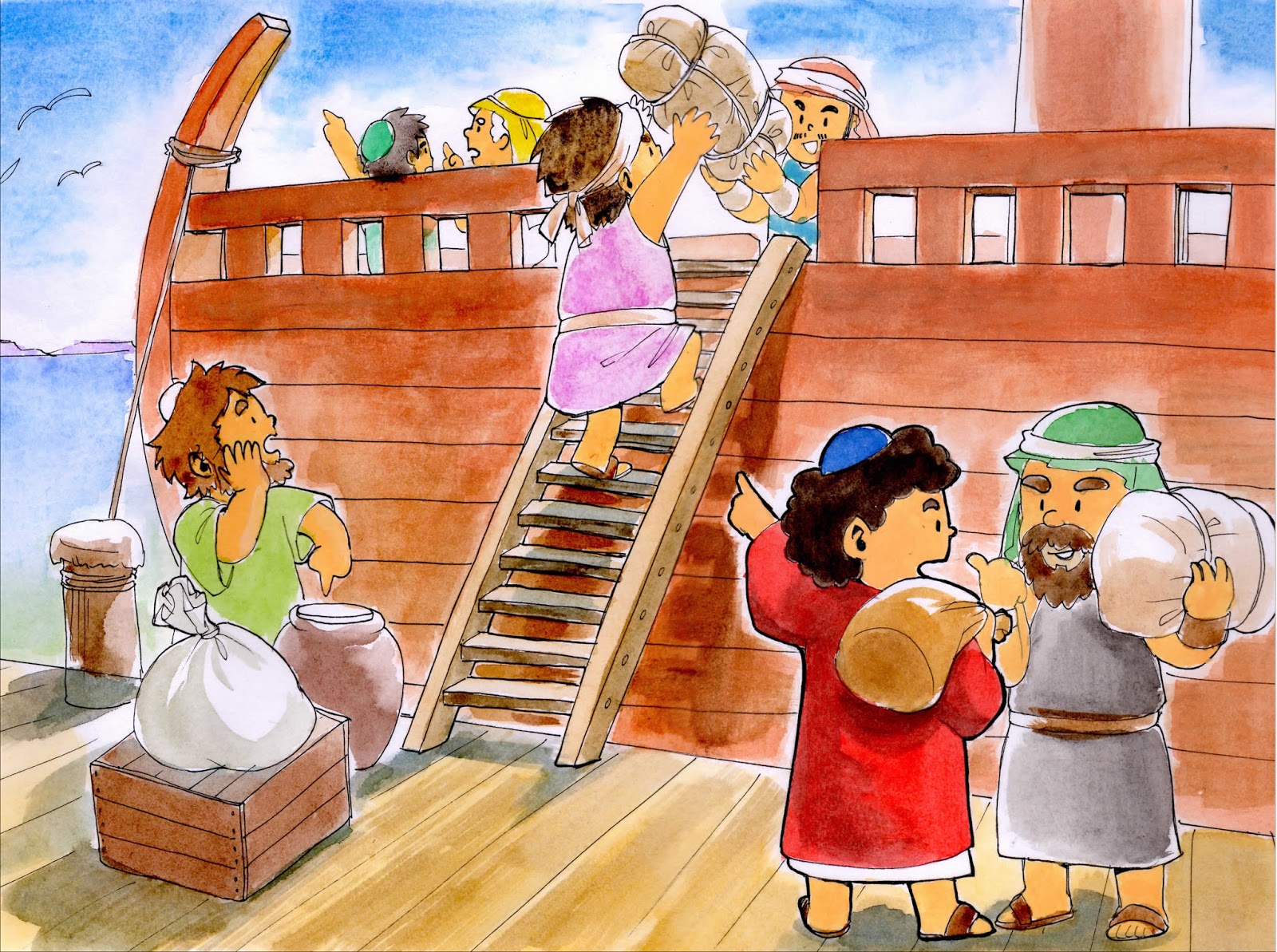 ヨッパにつくと、海が広がっています。港に大きな船が見えました。ヨナは、船長に聞きました。